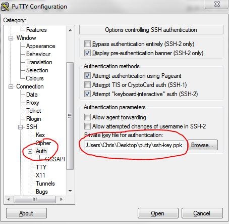 Im nächsten Schritt muss die Datei mit dem SSH-Key auswählen, den man auf dem Router hinterlegt hat. Dies geschieht über die Einstellung Private key file for authentication unter Connection → SSH → Auth. Danach kann man unter Session die Einstellungen mit einem Namen bei Saved Sessions versehen und mit Save abspeichern und die SSH-Verbindung mit Open starten.